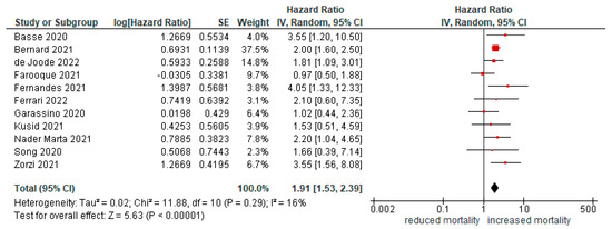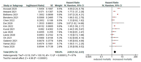 Fourteen papers [10,11,13,14,16,17,24,25,26,27,29,30,33,37] reported the risk of mortality in patients with respiratory or lung cancers. The risk of death was double in patients with cancer compared with those without cancer (HR = 2.00 [95%CI1.52, 2.63], p < 0.01; Figure 4). All studies reported HR adjusted for multivariate analysis except for the study by Assad et al. After exclusion of this study, risk of death remained significant even in multivariate analysis (HR = 1.85 [95%CI 1.4, 2.44], p < 0.01).
