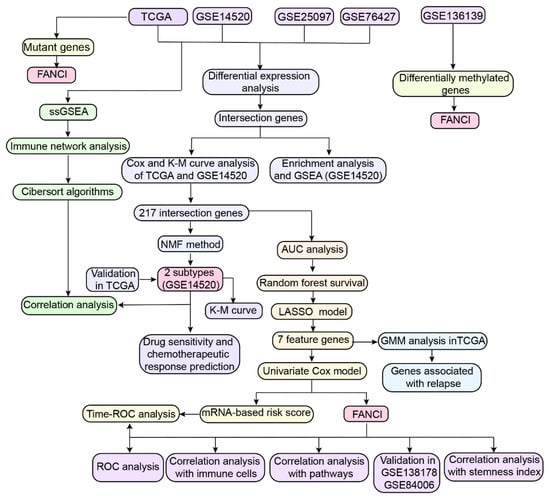 The following supporting information can be downloaded at: https://www.mdpi.com/article/10.3390/cancers14225721/s1, Figure S1: Pie charts of 4036 intersected DEGs overlapping across the four datasets; Figure S2: Gene set enrichment analysis and survival analysis of hepatocellular carcinoma (HCC) samples; Figure S3: Identification of hepatocellular carcinoma (HCC) subtypes based on the TCGA dataset; Figure S4: Clinico-demographic features associated with the mRNA expression-based stemness index (mRNAsi) and FANCI expression in hepatocellular carcinoma (HCC); Figure S5: Genomic landscape of hepatocellular carcinoma and DNA methylation changes; Figure S6: Correlation of FANCI expression and methylation status in hepatocellular carcinoma samples from The Cancer Genome Atlas, as determined by the MEXPRESS tool.