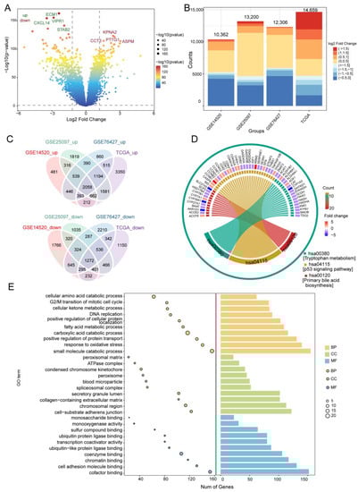 Differentially expressed genes (DEGs) in HCC and their enrichment in biological processes and KEGG pathways. (A) DEGs in the GSE14520 dataset. Red indicates upregulated genes and blue, downregulated genes. (B) Bar diagram of DEGs in the GSE14520, GSE25097, GSE76427, and TCGA datasets. (C) Up- and downregulated DEGs overlapping across the datasets, as visualized in a Venn diagram. (D) Overlapping DEGs enriched in various KEGG pathways. (E) GO terms of overlapping DEGs, including BP, CC, and MF. The x-axis represents the number of DEGs involved in GO terms, and the y-axis the significantly enriched GO terms. BP, biological process; CC, cellular component; MF, molecular function; GO, gene ontology; HCC, hepatocellular carcinoma; KEGG, Kyoto Encyclopedia of Genes and Genomes; TCGA, The Cancer Genome Atlas.