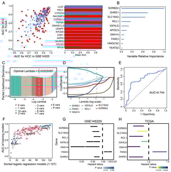 Univariate Cox and LASSO regression. (A) Evaluation of the diagnostic value of overlapping differentially expressed genes based on AUC. The 14 genes shown (red, upregulated; blue, downregulated) had AUCs >0.95. (B) Survival-related genes identified by univariate Cox regression analysis of 138 prognostic genes with AUC >0.80. (C) LASSO coefficient profiles of the 10 survival-related genes. (D) Ten-fold cross-validation of parameter selection in the LASSO model. (E) Time-dependent receiver operating characteristic curves of 5-year overall survival in HCC based on the seven feature genes. (F) Pattern of the Gaussian finite mixture model correlated with the AUC scores. There were three clusters of 127 combinations. (G,H) Univariate analysis of feature genes in the (G) GSE14520 and (H) TCGA datasets. AUC, area under the receiver operating characteristic curve; HCC, hepatocellular carcinoma; LASSO, least absolute shrinkage and selection operator; TCGA, The Cancer Genome Atlas.