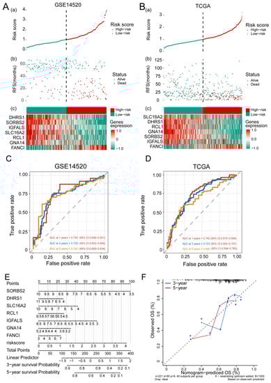The feature gene-based risk score serves as a prognostic tool in hepatocellular carcinoma (HCC). (A,B) (a) Risk score, (b) survival status, and (c) expression of the seven feature genes in high-risk and low-risk HCC patients from the (A) GSE14520 and (B) TCGA datasets. (C,D) Time-dependent receiver operating characteristic curves of 1-, 3-, 5-year overall survival of patients in the (C) GSE14520 and (D) TCGA datasets. (E) Quantification of overall survival using nomograms. Lines are drawn upward to determine the points received from the predictor. The sum of these points is reported on the “Points” axis. A line is then drawn downward to determine the 3- and 5-year survival probability based on the seven feature genes. (F) Calibration plots showing the performance of nomograms with an ideal model for 3- and 5-year survival. RFS, recurrence-free survival; TCGA, The Cancer Genome Atlas.