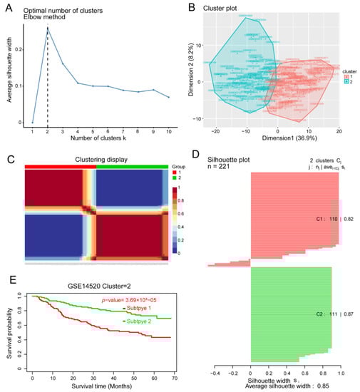 Clustering analysis based on prognosis-related genes was performed using non-negative matrix factorization (NMF) in the factoextra package in R (https://CRAN.R-project.org/package=factoextra, accessed on 21 September 2021) and the k-mean clustering algorithm. The average contour width was used to identify the optimal number of clusters. Subtypes were compared in terms of survival analysis.