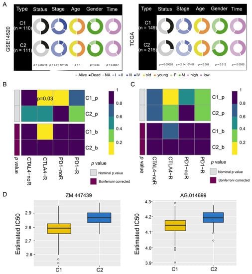 A comparison of clinical data distribution between the two HCC subtypes in GSE14520 and TCGA indicated that there was no significant difference in age between the two subtypes, but men were more prone to both subtypes of disease than women. In addition, subtype C1 showed shorter survival than subtype C2 (Figure 6A), as well as greater responsiveness to CTLA4-R therapy, based on data from GSE14520 (nominal p value = 0.03; Figure 6B) and TCGA (nominal p value = 0.09; Figure 6C). In contrast, subtype C2 in TCGA showed significantly greater responsiveness to anticancer drugs ZM.447439 and AG.14699 than subtype C1 (Figure 6D).