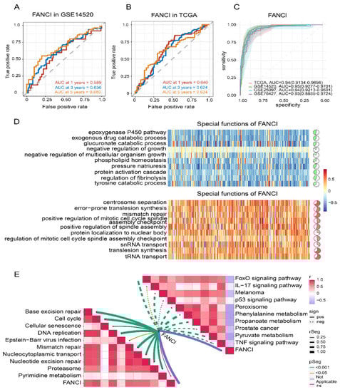 Time–ROC analysis and correlation of FANCI with biological and KEGG pathways. (A,B) Effect of FANCI on the 1-, 3-, and 5-year overall survival in the (A) GSE14520 and (B) TCGA datasets. (C) Effect of FANCI on the AUC values in different datasets. (D) Correlation of FANCI with biological processes (red, positive correlation; green, negative correlation). (E) Correlation of FANCI with KEGG pathways (red, positive correlation; green, negative correlation). AUC, area under the receiver operating characteristic curve; KEGG, Kyoto Encyclopedia of Genes and Genomes; ROC, receiver operating characteristic curve. TCGA, The Cancer Genome Atlas.