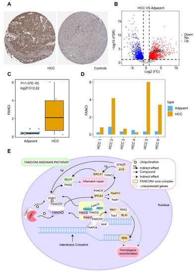 Potential regulatory mechanism of FANCI in hepatocellular carcinoma (HCC). (A) Expression of FANCI in HCC and normal tissues obtained from the Human Protein Atlas database. (B) DEGs in 6 HCC patients. Red indicates upregulated genes and blue, downregulated genes. (C) Expression of FANCI in HCC compared to adjacent obtained from 6 HCC patients. (D) Expression of FANCI in 6 HCC patients, respectively. (E) Role of FANCI in the Fanconi anemia pathway.