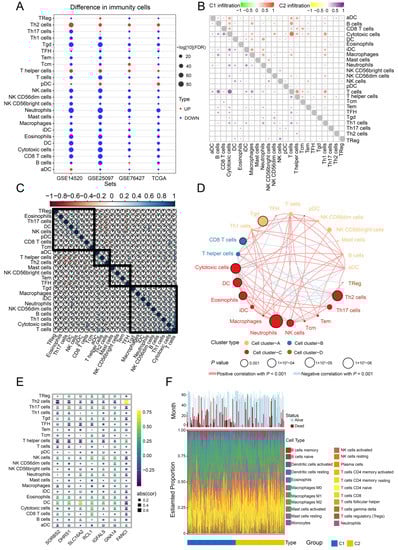 Infiltration and correlation between immune cells. (A) Levels of immune cell infiltration in the different datasets. (B) Correlations among the 24 types of immune cells in the two HCC subtypes C1 and C2. Red and purple represent positive correlations, while green and yellow indicate negative correlations. (C) Correlations among the 24 types of immune cells in HCC tissues. Blue sections indicate positive correlation, while orange sections negative correlation. (D) Immunity network analysis. Immune cells were grouped into four clusters depending on correlation. Circles represent the prognostic effect of each cell type, and the color of the line indicates stronger correlation. (E) Correlations of immune cell types with the seven feature genes. (F) Estimated proportions of 24 immune cell types and survival status in both subtypes. HCC, hepatocellular carcinoma.