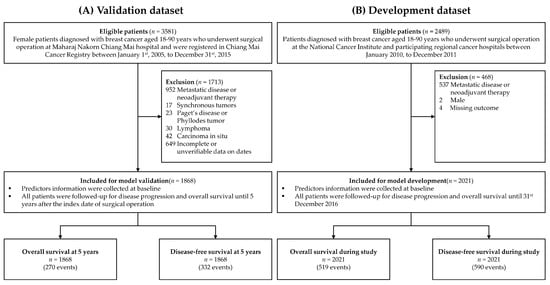 Our study size estimation was based on the previous guidance on sample size for designing an external validation study by Collins et al., which suggests that a minimum of 100 to 200 events are required for external validation of a prognostic model []. According to our preliminary review of patients diagnosed with breast cancer registered in the Chiang Mai Cancer Registry between 2005 and 2015, there were at least 820 deaths from 4096 patients. Provided that about half of these might be excluded, the remaining number of death events would still be sufficient.