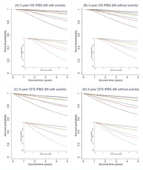 Predicted survival curves (solid lines) and the observed Kaplan–Meier estimates (dashed lines) for 5-year overall (OS) and disease-free survival (DFS) probability across 4 predicted risk groups using the IPBS model; (A,C) illustrate the results from multiple imputation methods, including cumulative hazard of events (MI with events), whereas (B,D) depicts the results from multiple imputation methods, not including cumulative hazard of events (MI without events).