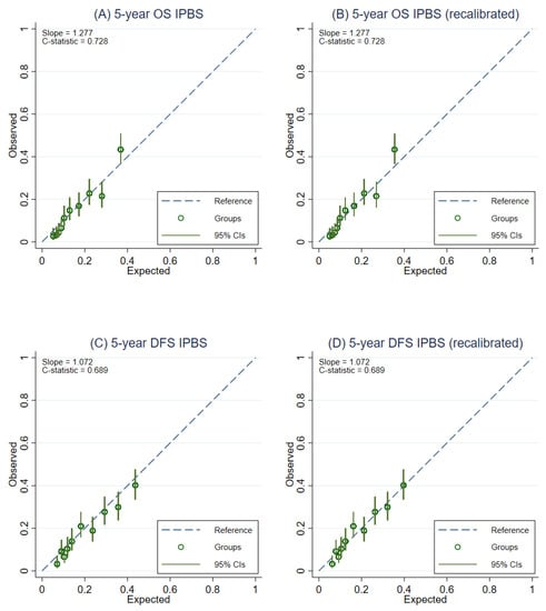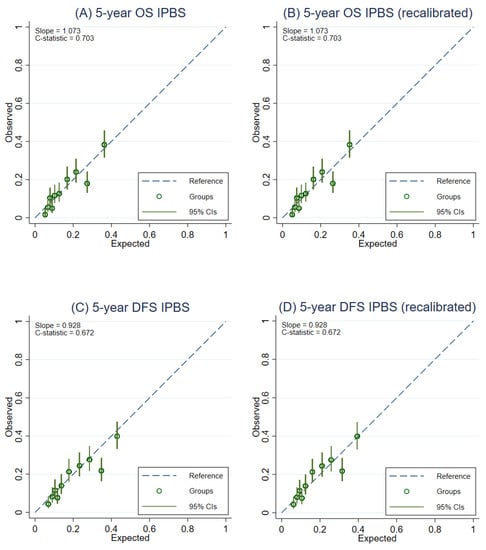 Calibration plots representing the external agreement between the observed and the expected probabilities of overall survival (OS) and disease-free survival (DFS) at 5 years of the IPBS model from complete-case analysis. Figure (A) 5-year OS, (B) 5-year OS after model recalibration, (C) 5-year DFS, and (D) 5-year DFS after model recalibration.