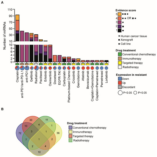 Landscape of miRNAs associated with therapy response in NSCLC. (A) Bar chart reporting the number of miRNAs (listed in Table S2) that are associated with therapy response in NSCLC. Different colours indicate relative evidence scores which were assigned to miRNAs based on the type of experiment conducted (i.e., cell lines, xenograft models and/or human cancer tissue). In X-axes, pie charts indicate the fraction of miRNAs whose expression is upregulated (red) or downregulated (blue) in resistant samples vs. sensitive ones. In grey, fraction of miRNAs with a discordant trend of expression regulation (up or down) in independent studies. Pie sizes are proportional to the statistical significance (binomial test) relative to the unbalance in up- or downregulated miRNAs, as per the legend. Type of drug treatment is also indicated in X-axes, as per the legend (see also Supplementary Methods for further details). (B) Venn diagram of the overlapping miRNAs associated to the indicated category of drug treatment. The list of miRNAs can be found in Table S3.