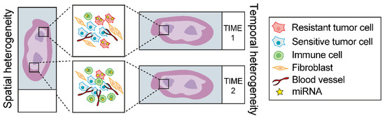 However, some limitations still apply for example in the bulk tumor miRNA expression profile analysis, which does not provide any clues about miRNA expression profile in specific cell types but rather gives an average expression quantification between tumor cells and TME. Notably, intratumoral biological and genetic heterogeneity bolsters the acquisition of drug resistance because of the presence of a treatment-resistant subpopulation of cells that can outgrow during the course of the treatment. Alternatively, some cells have the ability to survive initial treatment (i.e., drug-tolerant ‘persister’ cells) and acquire de-novo genetic and/or epigenetics alterations that give therapeutic resistance [147]. Such heterogeneity, which is functional to therapy resistance can be either spatial, where there is an uneven distribution of tumor subpopulation across different regions of the tumor, or temporal, which refers to a molecular variation of the tumor over time (Figure 2) [148,149,150]. Yet, differences in tumor purity (i.e., percentage of tumor cells in the tissue) may also puzzle the association of miRNAs expression with therapy response or with target gene expression thus leading to suboptimal assessments of correlation scores [151]. In addition, TME cellular components are known to reprogram the molecular profile and phenotypes of cancer cells [152,153,154,155], thus a different composition of TME and relative abundance in the cohort of samples analyzed can potentially hide a specific miRNA-related phenotype (Figure 2).