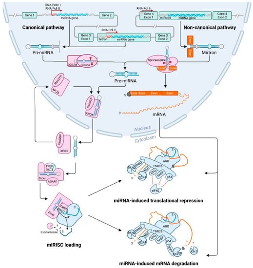 Transcription in the canonical pathway of miRNAs starts in the nucleus and is usually performed by RNA polymerase II (Figure 1) []. However, a few miRNA genes that are situated downstream of repetitive sequences, such as Alu repeats, can be transcribed by Polymerase III []. Intronic miRNA genes are almost exclusively regulated by Pol II promoters, whilst intergenic genes can be regulated by either Pol II or Pol III promoters. After transcription, a primary miRNA (pri-miRNA) is formed that contains a stem loop, a 5′ cap and 3′ poly(A) tail. When multiple miRNA genes are located in close proximity, this cluster can be transcribed in a polycistronic fashion, forming a single, long pri-miRNA that contains multiple stem loops [].
