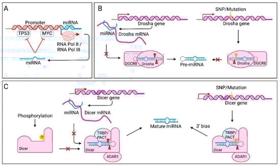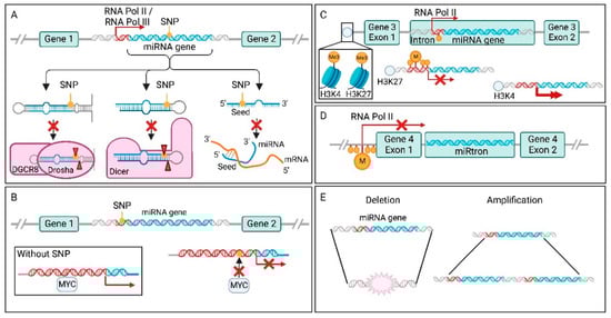 Genetic factors affecting microRNA expression and function in cancer. (A) Single nucleotide polymorphisms (SNPs) affecting the microRNA (miRNA) gene can alter miRNA production through impeding processing by ribonuclease III enzyme Drosha or Dicer, by alteration in binding and cleavage sites (red triangles). SNPs can also change the seed sequence, leading to a different targetome for the miRNA and thus altered post-translational regulation. (B) In addition to mutations in the miRNA gene itself, the promoter and transcription-enhancing region of miRNA genes can also acquire SNPs. This can impair binding of transcription factors, such as MYC, leading to decreased transcription of the miRNA gene. (C) Epigenetic modifications of the miRNA gene can also affect miRNA expression. Hypermethylation of the miRNA promoter, as well as histone methylation at H3K27, both repress transcription. On the other hand, histone methylation at H3K4 is associated with transcriptional activation of miRNA genes. (D) Some miRNA genes do not have a promoter of their own, which makes them dependent on their host gene. When the host gene promoter is hypermethylated, expression of the miRNA/mirtron is decreased as well. (E) Copy number variations are large chromosomal changes, which include deletions of miRNA genes, or translocations to other positions in the genome, creating gene amplification. When a part of the chromosome is amplified or deleted, the level of miRNA gene expression is decreased or increased, respectively (Created with BioRender.com).
