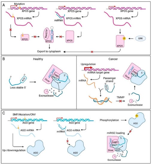 MicroRNAs (miRNAs) are small non-coding RNAs of ~22 nucleotides that regulate gene expression at the post-transcriptional level [,]. They are integrated into the miRNA-induced silencing complex (miRISC) after association with an Argonaute (AGO) protein []. In this context, they typically bind to the 3′ UTR of messenger RNAs (mRNAs) with their seed sequence, spanning 2–8 nucleotides from the 5′ end []. This binding usually leads to either translational inhibition or degradation of the mRNA, depending on the degree of complementarity between the two RNAs []. miRNAs are estimated to regulate around 60% of all protein-coding genes, with an average of 200 targets per miRNA [,]. This indicates their important regulatory function in different physiological and pathological cellular processes. The biogenesis and function of miRNAs is therefore a very tightly regulated process, and dysregulation of miRNA production, availability and target regulation has been associated with various human diseases, including cancer [].