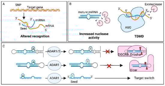 One essential element of miRNA-mediated target regulation, is complementarity between miRNA and target mRNA. However, when a miRNA gene has acquired SNPs in the seed sequence, this interaction can be affected (Figure 2A) []. Because miRNA molecules are small, the accumulation of loss-of-function or gain-of-function point mutations in their genes are rare events, especially in the smaller, more conserved seed region. Even though the accumulation of SNPs in mature miRNAs is rare, they are a key cause for miRNA dysregulation in cancer. One example of a SNP in the seed region associated with increased cancer risk is the rs3746444 SNP in mir-499a-3p []. This SNP is able to directly influence target recognition, resulting in a gain of new targets, as well as loss of a substantial number of original targets. The gained targets are concentrated around cancer related pathways, such as the NF-κB and PI3K-Akt pathway, leading to increased risk of developing gliomas [].