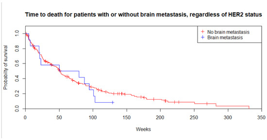 Although there were only 12 patients with brain metastasis, we observed no statistical difference in survival following the diagnosis of symptomatic brain metastasis in HER2-positive or -negative disease (median 29.9 weeks vs. 22.9 weeks; p = 0.6).