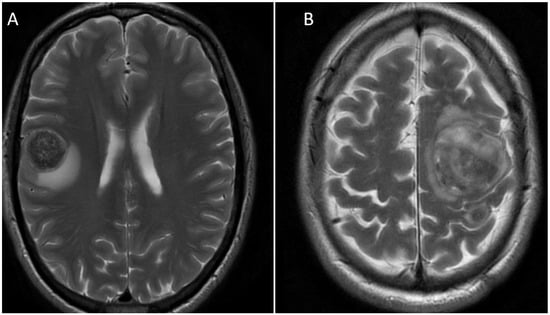The clinical course and treatments of the patients with brain metastases from GOCs are summarised in Table 2. There is a wide range in overall survival seen in this cohort (range 6–902 days). The patients with the longest survival had minimal extracranial disease with small-volume nodal disease only at time of diagnosis of brain metastases. Both patients (50- and 52-year-old males) presented with brain metastasis from primary gastroesophageal junction tumours, with only local nodal metastasis as their other sites of metastatic disease. Representative images of their initial brain metastases can be seen in Figure 2. This permitted adequate local treatment for the brain metastasis, including surgical metastectomy and post-operative radiotherapy, prior to proceeding to systemic therapies (see Table 2 below for further details). Interestingly, the first site of subsequent relapse in both patients was intracranial. This suggests a reduced intracranial effect of the systemic treatments used. Of the 12 patients, only 5 (41.7%) were able to proceed to systemic treatments following the diagnosis of brain metastasis. This demonstrates the devastating effect that brain metastasis has on functional status.