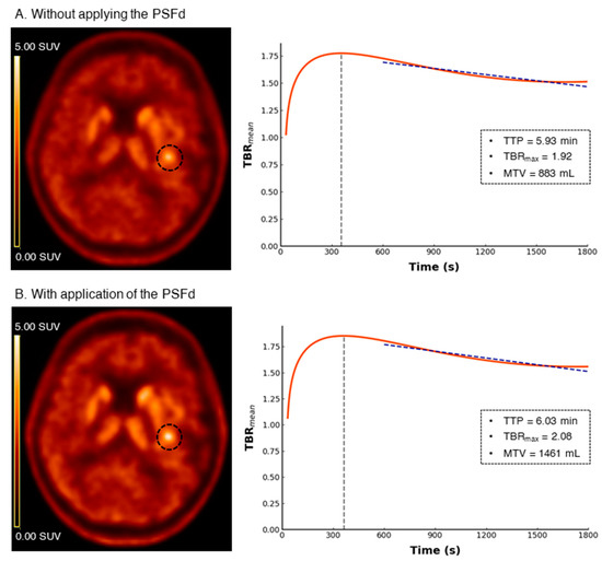 Representative 18F-FDOPA PET images for without applying the PSFd (A) and with application of the PSFd (B) alongside the related region-based time-activity-curve ratios (TACratio). Tumor volumes of interest are demonstrated on PET images with dashed circles. Application of the PSFd increases the contrast in tumor uptake, but effects on the TACratio, and consequently effects on TTP, obtained from the region-based analysis are limited. Patient characteristics: 75-year-old female patient classified as an IDH-wildtype glioblastoma. PSFd: point spread function deconvolution; TTP: time-to-peak; SUV: standardized uptake value; TBRmean: mean of tumor-to-background-ratio; TBRmax: maximum of tumor-to-background-ratio; MTV: metabolic tumor volume.