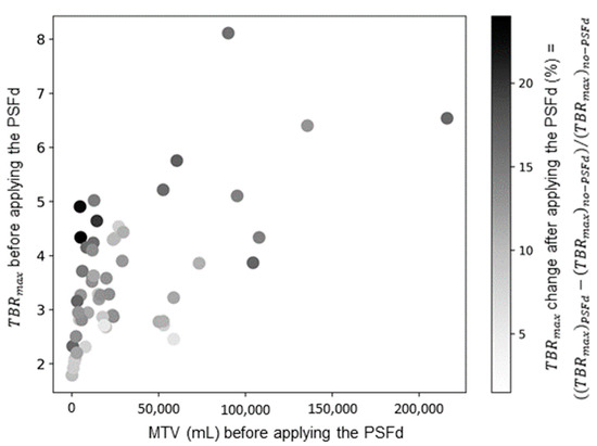 Distribution of TBRmax changes after applying the PSFd. TBRmax: maximum of tumor-to-background-ratio; MTV: metabolic tumor volume; PSFd: point spread function deconvolution.