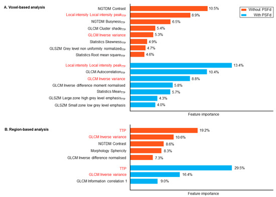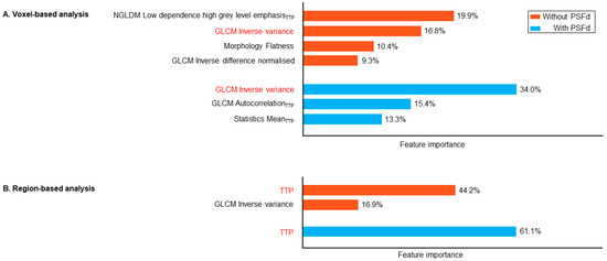 In the voxel-based analysis, 4 radiomics features contributed to at least 50% of model performance, but by applying the PSFd, this contribution was reduced to only 3 radiomics features. This reduced the number of TBR parametric image features from 3 to 1 (Figure 3). The region-based TTP was the most important feature for identifying an IDH mutation (61% with PSFd and 44% without) but applying the PSFd reduced the number of contributive TBR parametric features (from 1 feature without PSFd to none with PSFd).