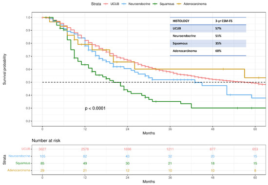 Kaplan–Meier analyses depicted CSM-FS rates in T2N0M0 patients treated with TMT (Figure 1). Specifically, 3-yr CSM-FS rates were 57%, 51%, 35%, and 60% for UCUB, neuroendocrine carcinoma, squamous cell carcinoma, and adenocarcinoma, respectively (p-value < 0.0001).