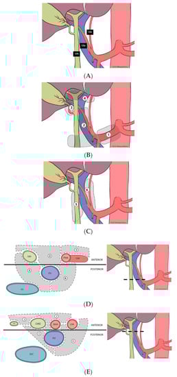 - Sato, T.; Ito, M.; Sakamoto, H. Pictorial dissection review of the lymphatic pathways from the gallbladder to the abdominal para-aortic lymph nodes and their relationships to the surrounding structures. Surg. Radiol. Anat. 2013, 35, 615–621. [Google Scholar] [CrossRef] [PubMed]