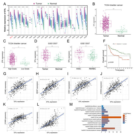 STIL was highly expressed in BC and was inextricably intertwined with the cell cycle. (A) Paired samples grouped by cancer from the TCGA show STIL expression in human cancers. Each point represents one sample. p-values are based on a two-tailed Student’s t-test. (B) Gene expression of STIL in BC and normal tissues based on TCGA database. (C) Gene expression of STIL in high-grade and low-grade BC tissues based on TCGA database. (D) Gene expression of STIL in BC and normal tissues based on the microarray data GSE13507. (E) Gene expression of STIL in MIBC and NMIBC based on the microarray data GSE13507. (F) The Kaplan–Meier plot shows the overall survival for STIL expression based on the GSE13507. (G–L) A correlation of STIL expression with proliferation marker MKI67 and the genes regulating the cell cycle, including CCNB1, CDK1, CCNA2, CCNB2, and CCNE2. (M) KEGG pathway enrichment results for the genes significantly correlated with STIL. STIL, SCL/TAL1 interrupting locus; BC, bladder cancer; MIBC, muscle-invasive bladder cancer; NMIBC, non-muscle invasive bladder cancer ( * p < 0.05, *** p < 0.001 and **** p < 0.0001).