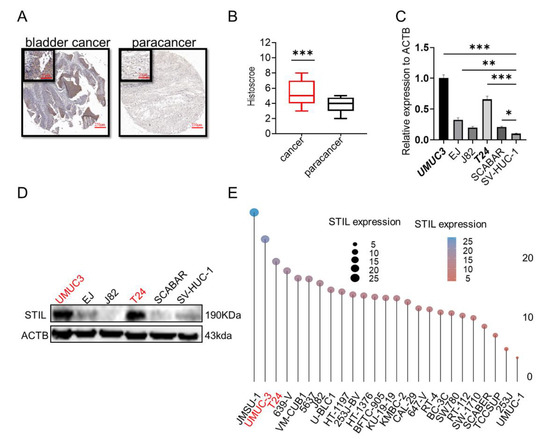 The expression of STIL in BC was higher than in the normal bladder. (A,B) Tissue microarray analysis of STIL expression in 16 paracancer tissues and 63 BC tissues. (A) Representative images of BC and paracancer tissues. (B) Histoscore of BC and paracancer tissues. (C) The mRNA levels of STIL in five BC cell lines (UMUC3, EJ, J82, T24, SCABAR) and the normal bladder cell line (SV-HUC-1). (D) Protein levels of STIL in the UMUC3, EJ, J82, T24, SCABAR, and SV-HUC-1 cells. (E) Expression distribution of STIL in different cell lines. The horizontal coordinate, dot size, and different colors represented levels of expression. The BC cell lines mRNA expression matrix was collected from CCLE (https://portals.broadinstitute.org/ccle, Accessed on 2 August 2022). This result was obtained by R (v4.0.3) package ggplot2 (v3.3.3) (ACTB, β-actin) (* p < 0.05, ** p < 0.01, and *** p < 0.001).