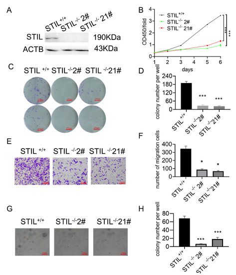 We performed a CRISPR-Cas9-based STIL knockout assay in the UMUC3 cell line. The STIL knockout cells, especially STIL−/− 2# and STIL−/− 21#, were screened for the best knockout efficiency by Western blot (STIL+/+: wild-type cell. STIL−/−: STIL knockout cell) (Figure 3A). In the Cell Counting Kit-8 (CCK-8) assay, STIL knockout revealed remarkable inhibition of cell proliferation (Figure 3B). The colony formation assay showed that STIL knockout significantly reduced cell proliferation (Figure 3C,D). Similarly, cell migration was significantly reduced by STIL knockout in the transwell migration assay (Figure 3E,F). Moreover, the colony size and the number on soft agar, which always indicate cell growth, were reduced in STIL knockout cells (Figure 3G,H). We also performed knockout of STIL in the T24 cell line using CRISPR-Cas9 technology, and finally obtained STIL−/− 8# and STIL−/−16# (Figure S1A). Similarly, we performed a CCK-8 assay (Figure S1B), colony formation assay (Figure S1C,D), transwell migration assay (Figure S1E,F), and soft agar assay (Figure S1G,H). The results show that the ability of T24 cell to proliferate and migrate was decreased after STIL knockout.