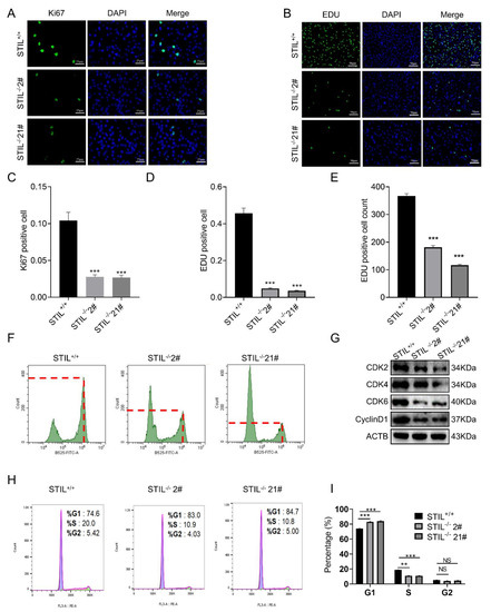 To understand the mechanisms of how STIL knockout inhibits BC tumorigenesis, we examined the cell cycle progression of STIL knockout UMUC3 cells and T24 cells. The results showed that STIL knockout markedly reduced the percentage of Ki67 positive cells (Figure 4A,C and Figure S2A,C) and 5-ethynyl-2-deoxyuridine (EDU) positive cells (Figure 4B,D and Figure S2B,D). Flow cytometry analysis showed that proliferation cells (EDU positive cells) were significantly reduced after STIL knockout (Figure 4E,F). To explore the relationship of STIL to the cell cycle in proliferation, we assessed changes in the cyclin-dependent kinases (CDKs). At the protein level, CDK2/4/6 and cyclin D1 were decreased after STIL knockout (Figure 4G and Figure S2E). Flow cytometry analysis showed that STIL knockout cells were stagnant in the G0/G1 phase to prevent cell proliferation (Figure 4H,I and Figure S2F,G).
