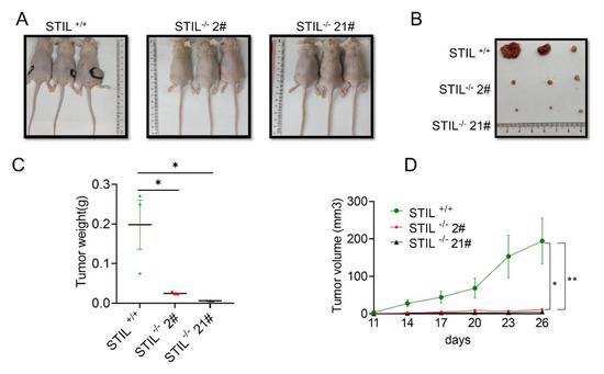 To demonstrate the function of STIL in vivo, we constructed a xenograft model. STIL+/+, STIL−/−, 2#, and STIL−/− 21# cells were implanted into nude mice. On the 26th day, tumors were removed from the nude mice. The solid tumor volume of STIL+/+ was significantly larger than that of STIL−/− 2# and STIL−/− 21# (Figure 5A–C). In addition, through dynamic observation of tumor growth, it was found that the tumor growth of the STIL knockout cells was slowed (Figure 5D). These results suggested that STIL knockout has a dramatic effect on the regulation of BC tumorigenesis in vivo.
