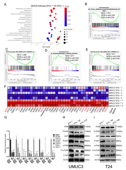 To further disclose the potential mechanism behind STIL-driven malignant behaviors in bladder cancer, we analyzed the differentially expressed genes in STIL-deficient UMUC3 cells and wild-type UMUC3 cells. The results of RNA-seq showed that the PI3K/AKT/mTOR/c-myc signaling pathways were significantly decreased in STIL-deficient cells compared to the wild-type, as found through GSEA analysis based on KEGG pathways (Figure 6A–C). We also checked the RNA sequencing of 412 BC patients from the TCGA database and divided the patients into a high-expression group and a low-expression group according to median STIL expression. We found that PI3K/AKT/mTOR/c-myc signaling pathways were significantly enriched in the high-expression group (Figure 6D,E). Our RNA-seq analysis results showed that the downstream molecules of the transcription factor c-myc (including MCM4, HSPD1, EIF2S2, DDX21, DDX18, CBX3, ABCE1, etc.) were significantly down-regulated in BC cells after STIL knockout (Figure 6F). To confirm this result, we verified by RT-qPCR, showing that the expression of these molecules was significantly decreased after STIL knockout (Figure 6G). To further demonstrate the relationship between STIL, the PI3K/AKT/mTOR pathway, and c-myc in BC, we performed an immunoblotting analysis. PI3K/AKT/mTOR protein levels did not fluctuate significantly after STIL knockout, but p-PI3K/p-Akt/p-MTOR/c-myc protein levels significantly decreased in STIL knockout BC cells (Figure 6H,I).