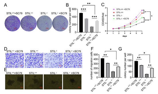 In the UMUC3 cell line, SC79 treatment partially reversed the effect of STIL knockout on cell tumorigenesis. (A) Representative microscope images and (B) quantitative analysis of colony formation assays. (C) Cell proliferation curves of CCK-8 assays. (D) Representative microscope images and (F) quantitative analysis of transwell migration assay. (E) Representative microscope images and (G) quantitative analysis of soft agar assay. In all the above experiments, four groups of cells were tested simultaneously (STIL+/++SC79, STIL+/+, STIL−/−, STIL−/−+SC79) (* p < 0.05, ** p < 0.01, and *** p < 0.001).