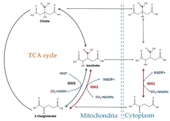The expression of the three IDH isoforms in human cells differs in their subcellular localization, molecular structure, cofactor requirement, and catalytic mechanism (Figure 1) [19]. IDH1 is localized in the cytoplasm and peroxisomes, whereas IDH2 and IDH3 are found in the mitochondria [20]. IDH1 and IDH2 (EC code: 1.1.1.42) share considerable sequence similarity (70% identity in humans) and catalyze the same reaction [20,21]. Reductive carboxylation of αKG to isocitrate by NADPH and CO2 can be catalyzed by IDH1 and IDH2, which catalyze reversible reactions [19,20,21]. Reversible CO2 fixation was also observed by isotopic analysis of TCA cycle intermediates in rat liver [22].