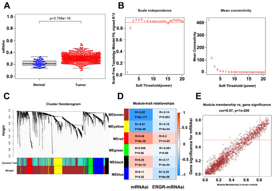 Identification of PCSC-associated genes. (A) Box plot showing mRNAsi scoring in tumor samples vs normal samples. (B) Optimal soft threshold settings. (C) Clustering dendrogram of 499 TCGA-PRAD samples. (D) Correlation index of each module with mRNAsi vs. EREG-mRNAsi. (E) Correlation index of genes in the brown module.