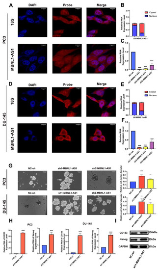 Subcellular localization of MBNL1-AS1 and its target genes, and examination of the effects of the target genes on stem cell function. (A–F) MBNL1-AS1 subcellular localization was confirmed by FISH and nucleoplasmic separation assays and sh-MBNL1-AS1 was transfected into PC3 and DU-145 cell lines, and the knockdown efficiency was determined by qPCR. (G) The sphere formation assay was used to examine the effect of MBNL1-AS1 knockdown on PCSC function. mRNA (H) and protein (I) expression levels of markers of stemness. ** p-value < 0.01; *** p-value < 0.001.