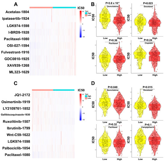 The prediction results for MBNL1-AS1 sensitivity (50% inhibitory concentration, IC50) suggested that the MBNL1-AS1 high expression group was more sensitive to Ipatasertib drugs and common chemotherapy drugs for prostate cancer, such as Gemcitabine and Docetaxel, whereas the MBNL1-AS1 low expression group was sensitive to Wnt signaling pathway inhibitor drugs, such as Paclitaxel_1080, LGK974_1598 (Figure 8A,B). Similarly, the prediction results for CDKN1B sensitivity (50% inhibitory concentration, IC50) suggested that the CDKN1B high expression group was more sensitive to JQ1_2172 drugs and common chemotherapy drugs for prostate cancer, such as Gemcitabine and Docetaxel. In contrast, the CDKN1B low expression group was sensitive to Wnt signaling pathway inhibitor drugs, such as Paclitaxel_1080, LGK974_1598 and Wnt-C59_1622 (Figure 8C,D).