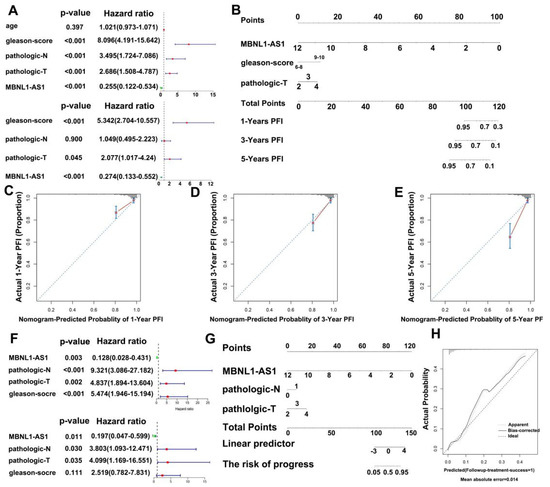 To further evaluate the clinical value of MBNL1-AS1 in the analysis of the PRAD samples in the TCGA-PRAD cohort, clinical characteristics were screened by univariate and multivariate Cox regression. In addition, the PFS at 1, 3 and 5 years was predicted based on the MBNL1-AS1 gene expression levels, Gleason score and T-stage, created in a nomogram (Figure 9A). The actual C-index obtained was 0.81 ± 0.17 (mean ± standard error), indicating that the actual PFS of the sample was generally consistent with the predicted PFI (Figure 9B). Finally, the calibration curves suggested that the nomogram was a good predictor of PFI (Figure 9C–E). Similarly, for distant metastasis in the PRAD samples, we generated a nomogram to predict tumor invasion and progression. After screening by univariate and multifactorial Cox regression analyses, we included the gene expression level of MBNL1-AS1, pathological T-stage, and N-stage into the model (Figure 9F,G). Our results revealed a nomogram C-index of 0.835 ± 0.05 (mean ± standard error), indicating that the actual distant metastasis rate was generally consistent with the predicted results. Calibration plots also showed agreement between the nomogram predictions and true distant metastases (Figure 9H).
