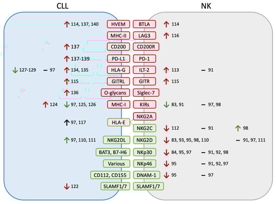 Altered CLL-NK ligand–receptor interactions. Ligand–receptor pairs are color-coded by their activating (green) versus inhibitory (red) effects on NK cells. Changes are listed as increases (↑), decreases (↓), or no change (–) and are similarly color-coded according to whether the measured change is expected to increase or decrease NK activation, as well as the relevant citations listed. Different studies have found varying (and, at times, conflicting) changes in ligand and receptor expression levels that broadly point to decreased NK activity against CLL. NKG2DL refers to the ligands of NKG2D (MICA, MICB, ULBP1-6).