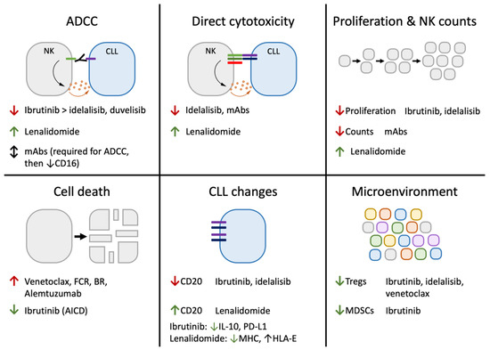 Key effects of CLL therapeutics on NK function. Current CLL therapeutics have been demonstrated to affect natural killer cells in a variety of ways. This includes directly increasing or decreasing NK cytotoxic function, proliferation, and death. It also includes indirect methods via these therapeutics’ effects on CLL and other cells in the microenvironment. Changes are listed as increases (↑) or decreases (↓), and are color-coded according to whether the measured change is expected to increase (green) or decrease (red) anti-leukemia NK activity.