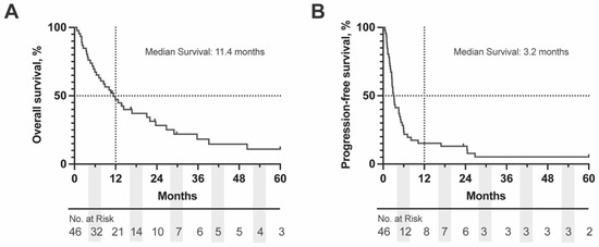 Kaplan-Meier (KM) Curve of (A) OS and (B) PFS for complete OM cohort. Dashed lines represent the 50% survival and 12 months, respectively. Number at risk is displayed below each graph in 6 months intervals. OS = overall survival, PFS = progression free survival.