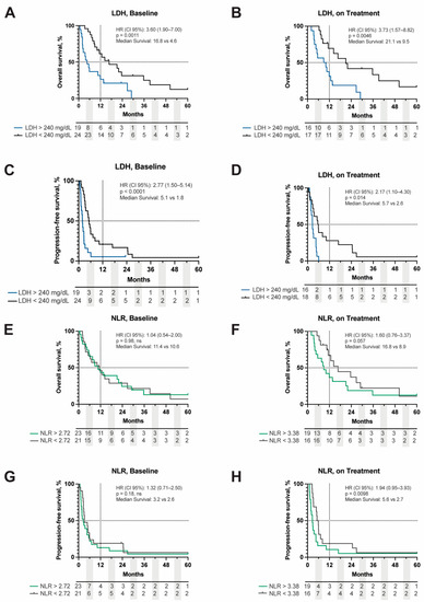 Kaplan–Meier curve of OS and PFS stratified by LDH value above or below 240 mg/dL at baseline (A,C) and on treatment (B,D). OS and PFS of NLR stratified by the median cut point of 2.72 at baseline (E,G) and 3.38 on treatment (F,H). Dashed lines represent 50%- and 12-month survival points, respectively. Hazard ratios (HR), p-values, and median survival are displayed in the upper right corner of each respective graph. Baseline = ICB start; on treatment = response assessment 8 weeks following ICB initiation. LDH = lactate dehydrogenase, NLR = neutrophil:lymphocyte ratio, OS = overall survival, PFS = progression-free survival.