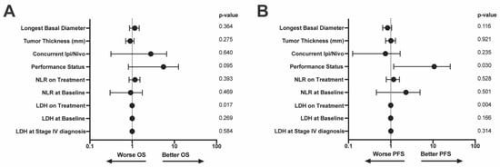 Multivariable model of (A) OS and (B) PFS. Variables included in the model are along the left y-axis. p-values associated with each variable are on the right y-axis. LDH = lactate dehydrogenase, NLR = neutrophil:lymphocyte ratio, OS = overall survival, PFS = progression free survival.