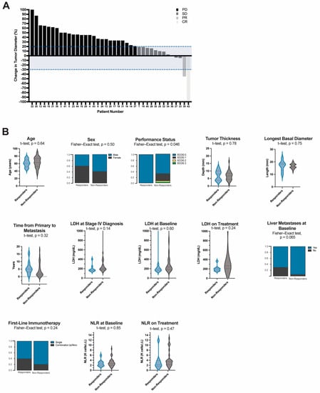 (A) Waterfall Plot of Tumor Response using RECIST criteria and (B) Demographic, hematologic, and treatment characteristics of responders compared to non-responders. Continuous variables are represented in violin plots with quartiles shown as dotted lines. Independent t-test was used to evaluate the difference in mean values between responders and non-responders. Categorical variables are represented by proportions of the analyzed variable within each group. Fisher-exact test was used for group comparisons. Responders (n = 10) are comprised of patients who derived a clinical benefit from treatment, i.e., complete response (CR (n = 1)), partial response (PR (n = 1)), and those with stable disease (SD (n = 8)). Non-responders (n = 34) are comprised of all those who had progressive disease (PD). Objective response was determined using RECIST criteria. LDH = lactate dehydrogenase, NLR = neutrophil:lymphocyte ratio.