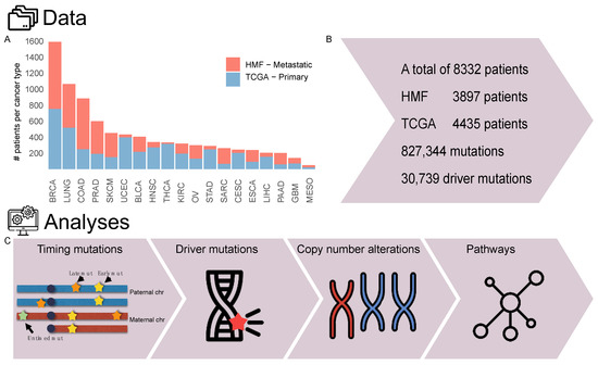 - Priestley, P.; Baber, J.; Lolkema, M.P.; Steeghs, N.; de Bruijn, E.; Shale, C.; Duyvesteyn, K.; Haidari, S.; van Hoeck, A.; Onstenk, W.; et al. Pan-Cancer Whole-Genome Analyses of Metastatic Solid Tumours. Nature 2019, 575, 210–216. [Google Scholar] [CrossRef] [PubMed]
