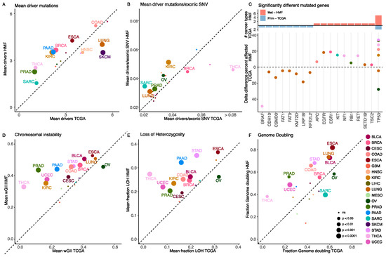 In order to compare the number of driver mutations between primary and metastatic tumours, we defined driver mutations based on pathogenic exonic mutations in cancer genes (Methods, Section 2.3). For the TCGA cohort, we identified 15,349 likely driver mutations from a total of 427,237 non-synonymous mutations from 4435 tumours. Similarly, for the HMF cohort, we identified 15,390 driver mutations from a total of 400,107 non-synonymous mutations from 3897 tumours. Overall, we observed that metastatic tumours harboured a slightly higher mean number of driver mutations (mean TCGA = 3.25, mean HMF = 3.65, p value < 2 × 10−16) (Figure S2A).