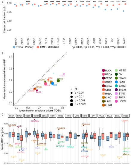 3.2. Most Cancer Genes Are Affected by Driver Mutations at the Same Frequency in Primary and Metastatic Cancer
