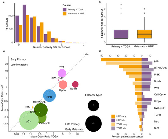 Genes and the proteins they code for act in synergy with each other and are connected through signalling pathways. While we only observed limited genomic differences between primary and metastatic cancer, we endeavoured to investigate whether a specific pattern could be observed of which pathways are affected in primary versus metastatic cancer. Therefore, we mapped all driver mutations to established cancer pathways [21]. On a Pan-cancer level we observed that metastatic cancer had a significantly higher number of mutated pathways compared to primary cancer (TCGA: mean = 1.68, median = 1, HMF: mean = 1.99, median = 2, p-value < 2 × 10−16, Figure 4A,B). We performed a pathway enrichment analysis to explore the timed pathways, and if there were any remarkable difference in timing on a pathway level. As we did for driver genes, we performed an enrichment analysis for early vs. late pathway hits for each dataset, and then we compared the results of the two. When we compared the significantly enriched timed pathways in primary cancer to metastatic cancer, we found that pathway timing was highly concordant, i.e., if a pathway was significantly enriched in early mutations in primary, it was never found significantly enriched for late mutations in metastatic and vice versa (Figure 4C). We observed that the odds ratios for the pathways of two datasets were highly correlated (pearson = 0.79, p = 1.82 × 10−10). As no shift was observed between primary and metastatic cancer, where events found late in primary cancer became early in metastatic cancer through further selection, this indicates that evolution in the metastatic setting may play a minor role in development of lethal metastatic cancer. The p53 pathway was overall the pathway most enriched in early mutations across cancer types (Primary: 13/19 cancer types, Metastatic: 14/19 cancer types), consistent with a defining role in cancer development. Only CESC, KIRC, MESO, SKCM and THCA were not enriched for early p53 pathway hits, while in PAAD it was only enriched in metastatic tumours. The KRAS and Cell cycle pathways were also highly enriched in early mutations, RTK/KRAS in 7 metastatic and 4 primary cancer types, and Cell cycle in 6 metastatic and 2 primary cancer types (Figure 4C). Conversely, while early pathway hits were quite consistently enriched in p53, RTK/KRAS and Cell cycle pathway genes, late pathway hits affected more pathways. These included Hippo (Primary: 4/19, Metastatic: 3/19) in BRCA and COAD for both and STAD and UCEC for primary and PAAD for metastatic, Notch (Primary: 4/19, Metastatic: 4/19) in COAD and OV for both and UCEC and SKCM in primary and BRAC and PRAD in metastatic, Wnt (Primary: 3/19, Metastatic: 3/19) in BRCA and UCEC for both and STAD for primary and COAD in metastatic (Figure 4C). When we explored the number of times pathways were hit pan-cancer, we found more hits to the three most affected pathways (TP53, RTK/KRAS, PI3K) by early mutations in metastatic cancer, relative to what was observed in primary cancer. However, overall the differences between metastatic and primary cancer were limited and non-significant (Figure 4D), supporting that the timing of pathway hits is concordant (pearson = 0.79, p = 1.82 × 10−10).