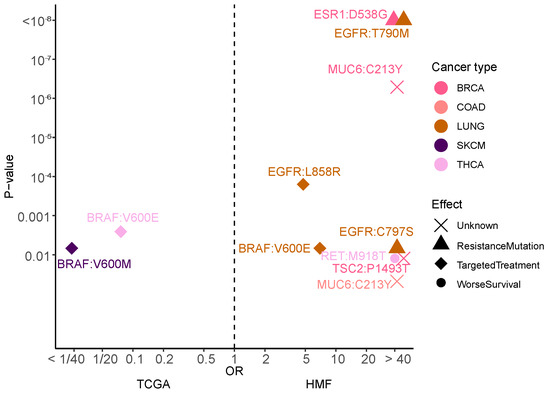 Enrichment of specific variants. A volcano plot showing the variants that are enriched in primary or metastatic cancer. Enrichment determined by Fisher’s exact test. The shape of the dot represents the effect of the mutations based on literature.