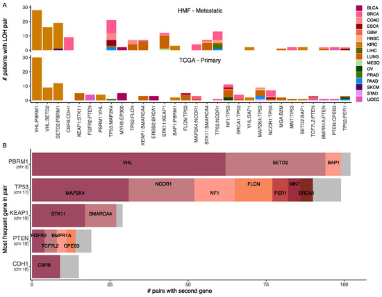 Driver gene pairs in areas of LOH. (A) Bar plot showing the pairs of driver genes found in areas of LOH in metastatic (top) and primary (bottom) cancer. (B) Stacked barplot showing the partner genes for the five most frequently occurring genes in LOH gene pairs.